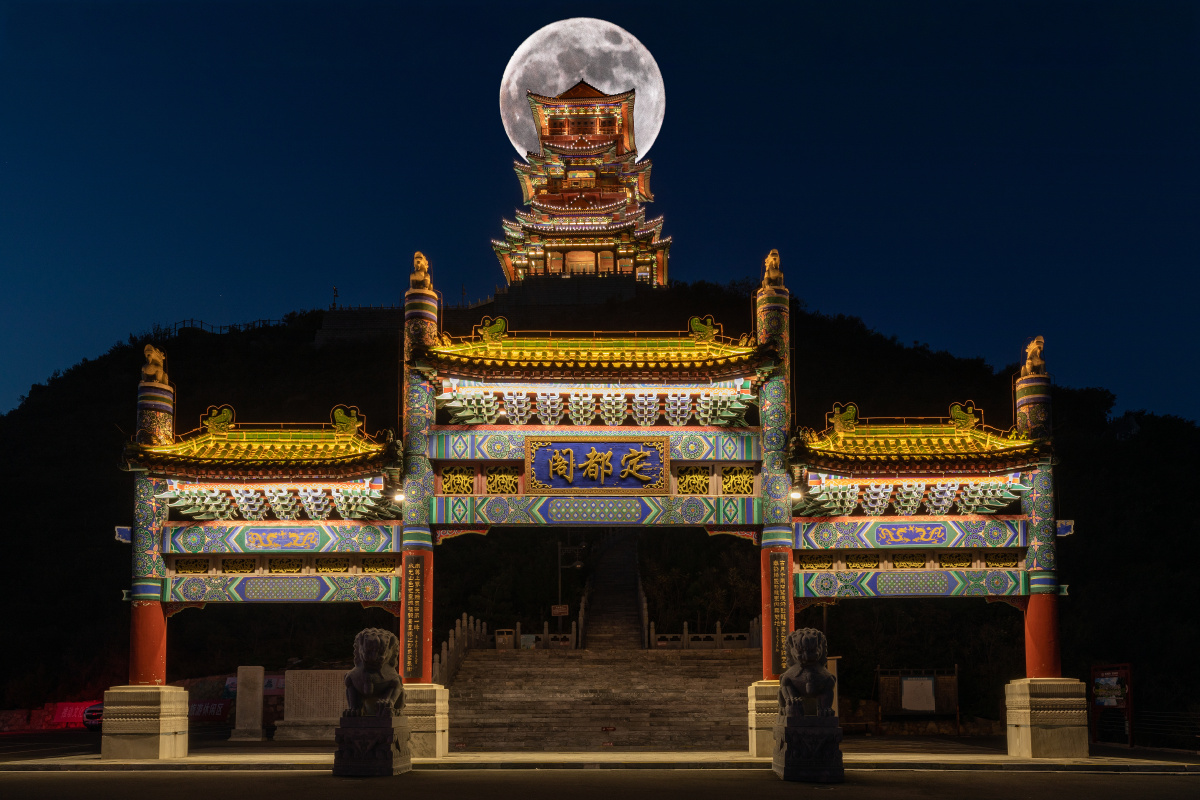 冬日夜幕降临,定都峰古建筑亮起照明灯,一轮圆月对上了定都阁。